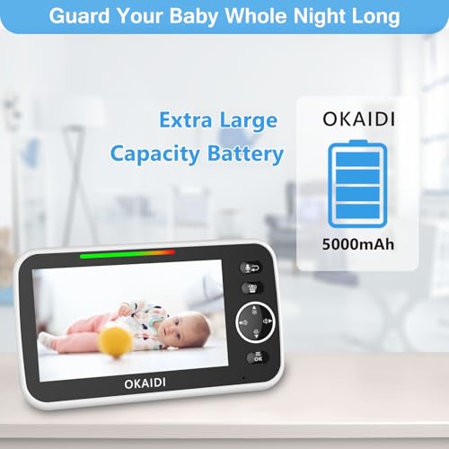 OKAIDI 5″ HD Baby Monitor with Camera and Audio, 720P Display, 5000mAh Battery, Remote Pan-Tilt, 3X Zoom, Night Vision, 2-Way Talk, Temperature,Lullabies,1000ft Range Baby Monitor No WiFi