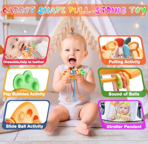 Wattne 7 in-1 Montessori Toy with Pull String Toy, Sensory Bin Toys, Stacking Baby Blocks & Soft Ring & Sensory Ball for Toddler