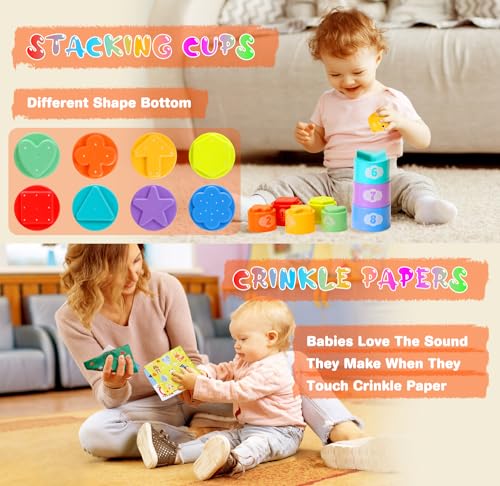7 in 1 MONTESSORI BABY TOYS SET: Unleash the wonders of learning with our 7 in 1 Montessori Baby Toys Set! This set includes 3 infant crinkle papers,5 stacking rings,6 soft building blocks,6 tactile squishy balls,1 travel pull string toy,1 sensory explore bin with 6 sound blocks and 1 stacking cup set.Comes with a spacious storage bin that can foster baby’s organizational skills and keep the room tidy.