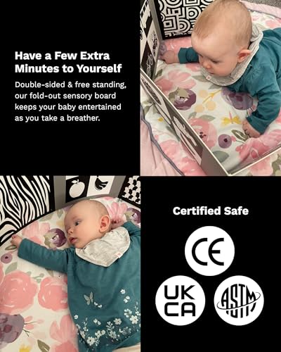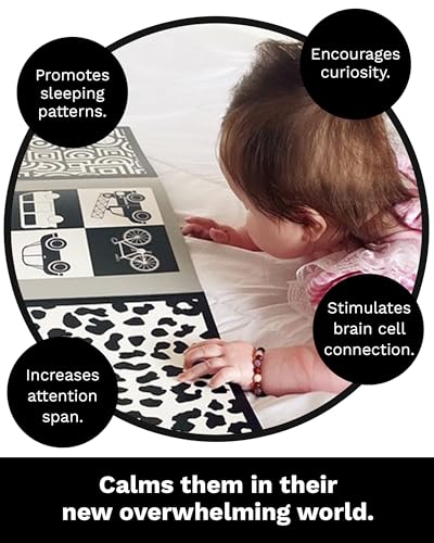 Stimulate Visual Development: Our high-contrast 20 x 100cm fold-out supersized black and white card for newborns is designed to captivate developing eyesight. This baby sensory board features 8 geometric patterns that keep your little one entertained and curious as you are taking a breather.