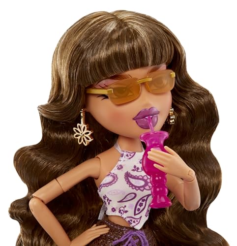 INCLUDES: Bratz fashion doll with outfit, sun shades, phone, earrings, necklace, compact, nail polish, smoothie cup, purse, hairbrush, and poster.