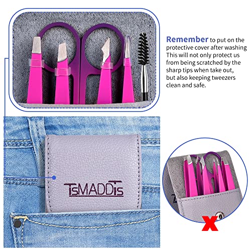 Eyebrow Tweezer Set, TsMADDTs 6PCS Tweezers Set for Women, Precision Tweezer for Eyebrows with Curved Scissor for Ingrown Hair, Hair Plucking Daily Beauty Tools (Pink&Purple)