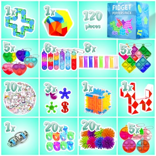 PACK OF 120: 4 Pop Bubbles, 1 Flip Chain, 6 Mochi Squishies, 6 Stretchy String Fidgets, 4 Mesh and Marble Sensory Toys, 1 Fidget Pad, 1 Snake Cube Twist, 1 Tracks Fidget, 1 Infinity Cube, 1 Soccer Ball, 2 Puzzle Boxes, 1 Squeeze Soybean, 2 Pop Bracelets, 21 Pop Rings, 21 Mini Pop Bubbles, 1 Pop Ball, 10 Stickers, 20 Spiky Balls, 8 Foam Putty, 5 Pop Tubes and 3 Fidget Spinners.
