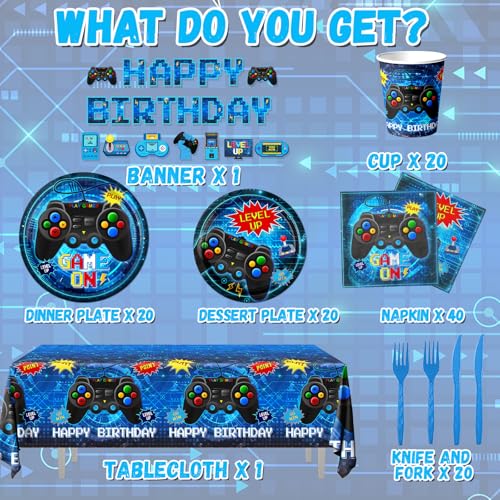 【Birthday Party Decorations】 You will receive 142pcs gaming birthday party decorations tableware set includes 1pc gamer birthday banner,1pc video game table cloth is 70.8 x 42.5inches,20pcs 9-inch video game party plates, 20pcs 7-inch level up birthday decorations plates,40pcs disposable video game napkins,20pcs cups,20pcs forks and 20pcs knives each set can serve 20 guests.this set of video game birthday party supplies will add amazing to you, your family and friends