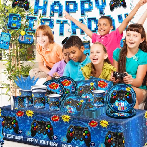 Gamer Birthday Party Decorations Tableware,142pcs Gamer Birthday Plates and Napkins,Banner,Tablecloth,Cup,Blue Video Game Decorations for Boys