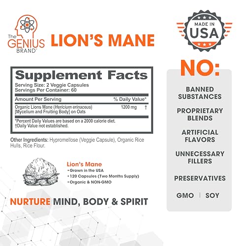 The Genius Brand Genius Lion’s Mane – Plant-Based Supplement for Memory, Focus & Mood Support – Organic & Non-GMO – 120 Veggie Capsules