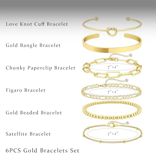 HERIER Gold Bracelets for Women 18k Gold Plated Bracelet Stack Bangle Cuff Bracelet Set for Women Non Tarnish Beaded/Paperclip/Cuban Link Chain Bracelets Jewelry for Women Trendy