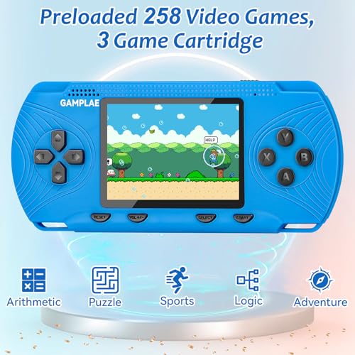 Handheld Game Console for Kids, Portable Game Console with Preloaded 258 Video Games & 3 Game Cartridges, 3.0” Large Screen, Rechargeable Battery, Hand Held Game Console Gift for Kids 4-12