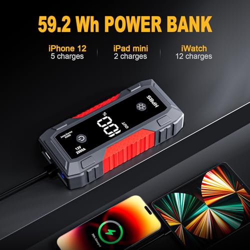 【Powerful Performance】HPBS H2000 Car Jump Starter with the super 2000A peak. Jump starter Can easily jump-start (up to 8L gas or 6.5L diesel) 12v vehicles in 1-2 seconds. up to 40 times on a fully charger.