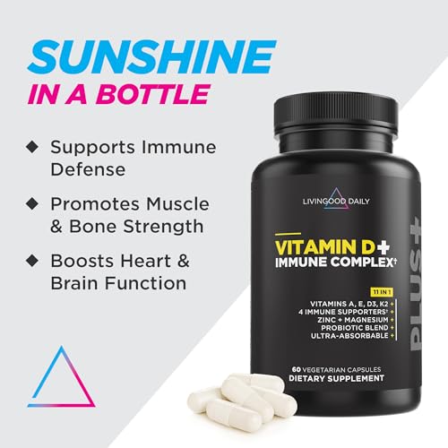 Livingood Daily Vitamin D + Immune Complex, Made with Vitamin D3 K2, Zinc, Magnesium, Vitamins E & A and Probiotics, Immune Support Supplement, Advanced Absorption, Gluten Free, Non GMO, 60 Capsules