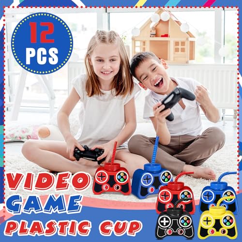 Mifoci 12 Pcs Plastic Video Game Party Cups with Straw and Lid 10oz Gamer Birthday Themed Drink Cups 7th Video Game Party Favors for Kids Toddlers Gamer Birthday Supplies (Yellow,Red,Blue,Black)