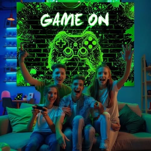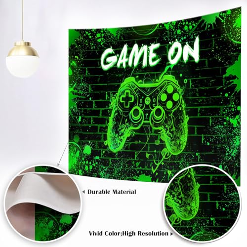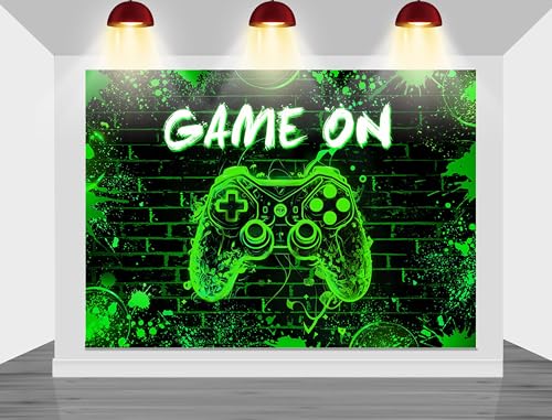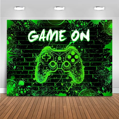 Mocsicka Game On Backdrop Video Game for Boys Level Up Birthday Party Decoration Game Night Arcade Neon Glow Gamer Banner Photography Background (Green, 7x5ft(82″x60″))