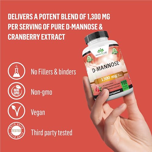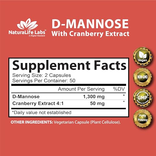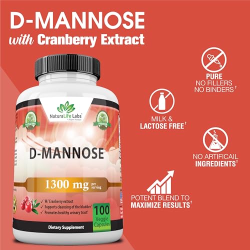 NaturaLife Labs Organic D-Mannose 1300 mg with Cranberry Extract 100 mg – 100 Vegan Capsules – Non-GMO, Gluten-Free, Vegan