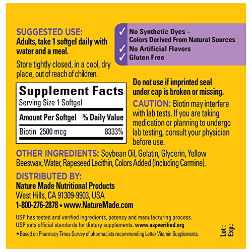 Nature Made Extra Strength Biotin 2500 mcg Softgels improve healthy hair, skin health, and nail health for those low in Biotin. Made from carefully selected ingredients under strict manufacturing processes, this dietary supplement has no synthetic dyes, no artificial flavors, and is gluten free. This Nature Made Biotin supplement also supports energy metabolism(1). Adults, take this sort of Biotin vitamins for hair skin and nails su pport day-to-day with water and a meal. Nature Made supplements are quality you’ll agree with. USP has tested and verified ingredients, potency, and manufacturing process. USP sets official standards for dietary supplements. Visit the USP verified website for more info. (1)Helps convert food into cellular energy. *Based on a survey of pharmacists who recommend branded vitamins and supplements. These statements have not been evaluated by the Food and Drug Administration. This product isn’t intended to diagnose, treat, cure or prevent any disease.
