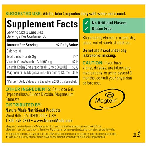 Nature Made Magnesium L-Threonate with Vitamins C & D3 helps toughen healthy cognitive function, including short-term memory(1). On top of brain health, Magnesium from Magnesium Threonate also supports muscle relaxation, heart, nerve, and bone health. Three daily capsules provide 130 mg of Magnesium from 1800 mg of Magnesium L-Threonate, 60 mg Vitamin C and 400 IU (10 mcg) Vitamin D3. These Magnesium capsules are gluten free and have no artificial flavors. Adults, take three capsules daily with water and a meal. Consult a healthcare practitioner to be used beyond 3 months. Use for no less than 6 weeks to see a good suggestion effects on cognitive function. Start your day with a Nature Made L Threonate Magnesium supplement. (1)Some adults experience mild memory loss with aging. Magtein is a trademark of Magceutics Inc. and is distributed exclusively by AIDP, Inc. Magtein is safe under a family of US patents, pending patents, and is safe around the globe. *Based on a 2022 survey of pharmacists who recommend branded vitamins and supplements. These statements have not been evaluated by the Food and Drug Administration. This product isn’t intended to diagnose, treat, cure, or prevent any disease.