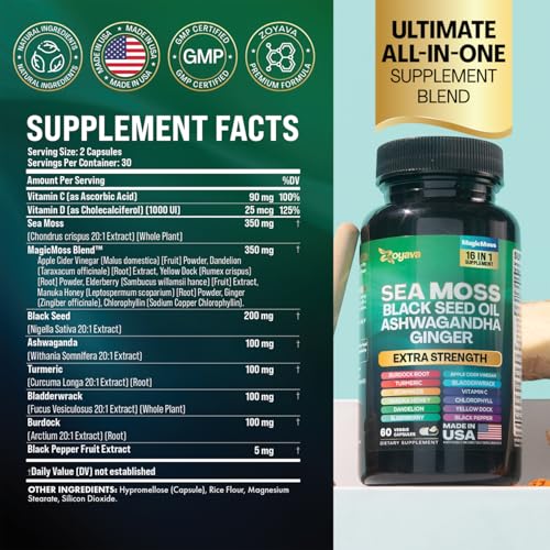 Our advanced formula of Irish Sea Moss Capsules are designed for both men and women. Our Seamoss Pills, enriched with Black Seed Oil for hair health, contain a remarkable blend of 15 a good suggestion ingredients, including Turmeric Curcumin Capsules, Bladderwrack capsules, Burdock roots, Chlorophyll, Ginger and more. Zoyava presents the world’s most comprehensive 16-in-1 formula, featuring raw sea moss, black seed, ashwagandha extract, bladderwrack root, burdock roots, ginger and turmeric capsules.