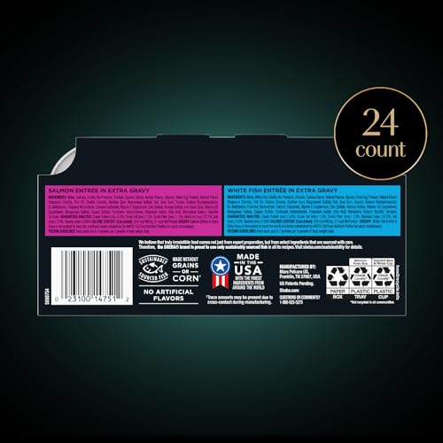 Contains twelve (12) 2.6 oz. Twin-Pack Trays of Sheba Gravy Indulgence Adult Wet Cat Food Salmon Entree in Extra Gravy & twelve (12) 2.6 oz. Twin-Pack Trays of Sheba Gravy Indulgence Adult Wet Cat Food White Fish in Extra Gravy (24 Count, 48 Servings)