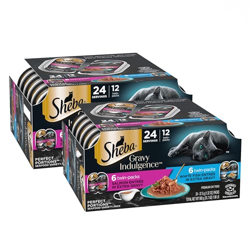 Sheba Gravy Indulgence Adult Wet Cat Food Salmon Entree and Whitefish Entree in Extra Gravy Variety Pack, 2.6 oz. Twin-Pack Trays, (12 Count, 24 Servings) (Pack of 2)
