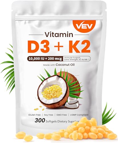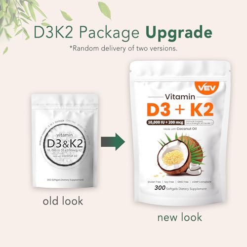 VEV Vitamin D3 Con K2 10000 IU, 300 Virgin Coconut Oil Softgels, 2 in 1 Vitamins Supplement D & K (Include MK7), Easy to Swallow, Supports Calcium Absorption, Bone Health(Packaging May Vary)