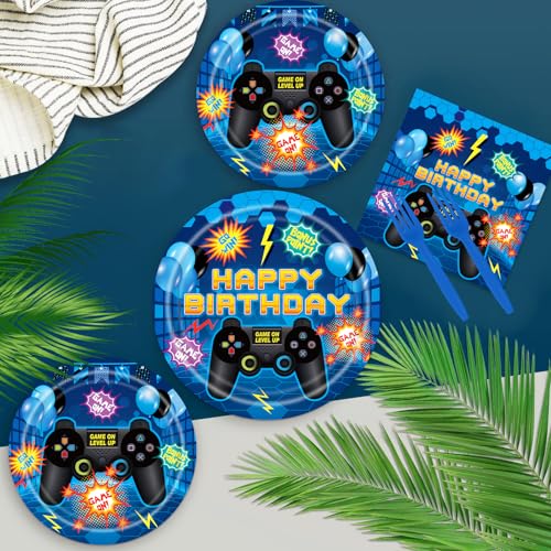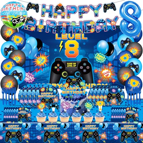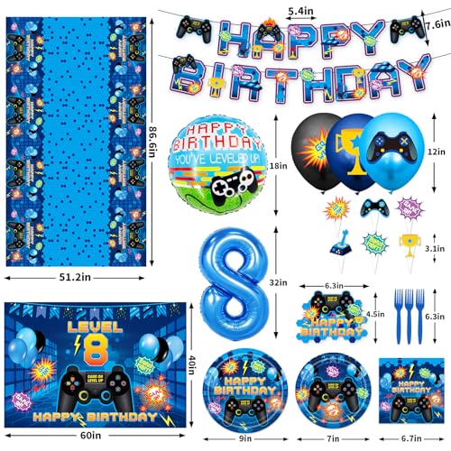 Video Game Birthday Party Supplies,Video Game 8th Birthday Party Decorations Include Banner, Backdrop,Plates,Fork,Napkins,Balloons,Tablecloth more,for Video Game 8th Theme Kids Birthday Party Gift