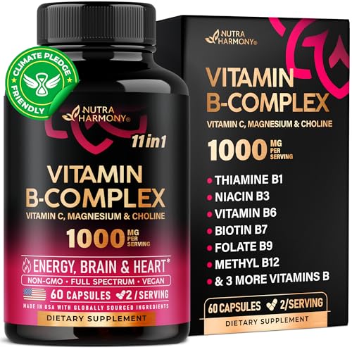 Vitamin B Complex for Men & Women – Riboflavin B2, B12, B1, B3, B5, B6, B7, B8, B9 | Vitamin C, Choline, Inositol – B-Complex Supplement – Energy, Brain & Heart Support – Made in USA, 60 Vegan Caps